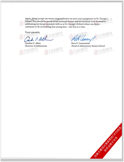 小關自從參加過英國和美國的夏令營后,就喜歡上了國外的教學體制和方法,心里一直有一個出國夢,但媽媽不放心提早出去,可他是一個非常有野心的孩子,之前自己在關注美國的學校,2月底才得知3.29日加拿大圣喬治頂尖貴族學校來訪,之前一點兒都不了解,媽媽多方了解到加拿大是相對比較安全的英語國家,且教學嚴謹,圣喬治學校不亞于美國好的私校,于2.29日雙方簽署了留學合同開始操作。萬佳留學李紅芬老師和文案同事和媽媽深度溝通后,媽媽也逐漸了解到圣喬治的錄取難度以及我們所面臨的壓力和挑戰(zhàn),尤其是這么短的時間去應付,所以好幾次都會哽咽“說是自己把孩子給耽誤了”,當媽媽的真的不知道怎么做為好,只有真正做了才知道,尤其是頂尖私立貴族學校。據圣喬治國際事務部負責人Gordon Allan 先生說,他們從來沒有直接錄取過十年級的中國學生,是屬于高一的課程,難度是最高的了,學校明確講寧愿名額空出來,也一定不會降低錄取標準。SSAT成績是一方面,學生需要通過嚴格的考核,長達兩個小時的筆試以及40分鐘左右的面試以及家長的面試,且小關面試那天筆試恰巧是安排在晚上,口試是在第二天上午,占了兩天的時間;怎樣在短短的時間內凸顯你,讓校方認同你,不僅語言能力,更重要的要結合圣喬治要求的六個核心理念“同理心、謙卑、誠實正直、尊重他人、勇于承擔、抗逆能力強”。通過我們和小關同學和媽媽的多次溝通,發(fā)現他是一名樂觀、積極、向上、陽光、有愛心、熱愛運動、生活自理能力強的健康男孩子。他的動手能力非常強,從小就喜歡拼裝各種模型,如機器人模型、汽車模型等??釔鄞蚧@球,經常參加校內外的籃球活動。去年暑假還遠赴美國參加了喬丹飛人訓練營,受益頗多。不僅和其它國家的小朋友切磋球技,還在語言交流上有了很大的提高。他還極富領導力和團隊意識,小關成長了許多對外界有更多和更深的了解。從思維和邏輯上怎樣游刃有余的與面試官面對面,珍惜好與面試官的每分每秒,這完全離不開我們文案老師對小關同學的深度培訓,細致到“如果給你100加幣的話,你會怎么花”等等一些前瞻性的問題,引發(fā)學生多方面思考;包括家長怎么面試,尤其是一直緊張的媽媽,在臨面試前連續(xù)發(fā)燒,為孩子的事情心急如焚,爸爸是醫(yī)生提前安排好病人手術也無法來到現場,無形中施加了很大的壓力,我們和學生家長一起又是怎么默契配合的呢?所有的這一切,可能只有經歷了才知道,尤其是在我們經歷了許多貴族學校面試的成功案例的一個強大團隊背后的支持下,經得起考驗。面試結束后,小關媽媽說的最多的話就是“感謝你們,我和孩子盡力了,你們也幫我盡了最大努力了,至于結果就看老天爺了”。的確是這樣,我們努力了,做到問心無愧,一切順其自然就好。