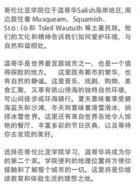 此外,溫哥華市還坐落了:亞歷山大學(xué)院,道格拉斯學(xué)院,哥倫比亞學(xué)院等以轉(zhuǎn)學(xué)分到優(yōu)質(zhì)大學(xué)而聞名遐邇的院校。