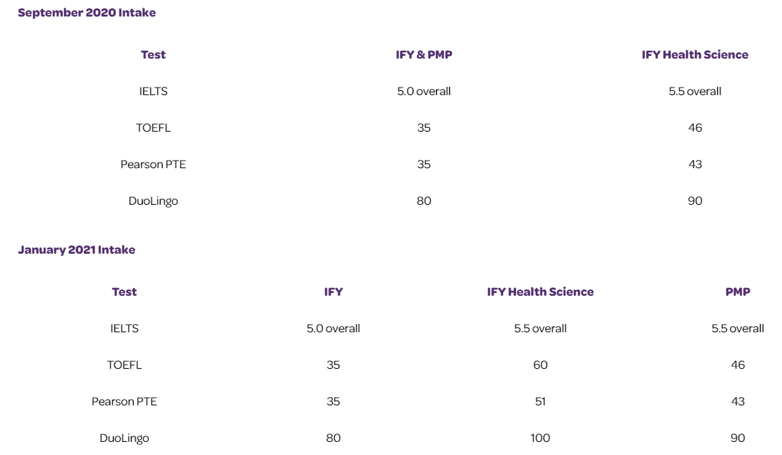 鑒于COVID-19導(dǎo)致各類(lèi)英語(yǔ)水平考試在全球范圍的大規(guī)模取消,都柏林大學(xué)決定從即日起臨時(shí)增加 Duolingo English Test (DET)為大學(xué)認(rèn)可的英語(yǔ)水平考試。受疫情影響,12周與7周語(yǔ)言課改為線上授課,費(fèi)用也相應(yīng)減少,DET的分?jǐn)?shù)要求及語(yǔ)言課詳情見(jiàn)下圖:
