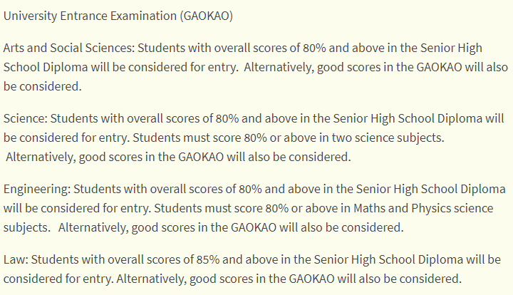 接受北京、上海和廣東省的高考生申請,高考總分(百分比換算)需達到80%或以上。