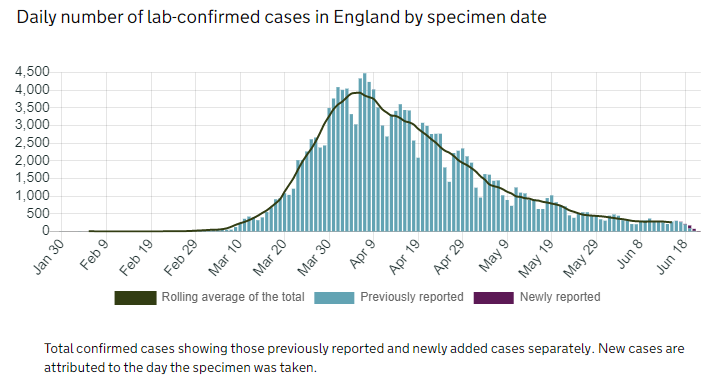 今年,對(duì)于全球來講,都是不容易的一年。疫情的消除不是短時(shí)間可以達(dá)成的,但是英國(guó)疫情如今控制的不錯(cuò)。在四月份疫情高峰期過后,每天確診人數(shù)逐日遞減。一份來自GOV.UK的英格蘭每日確診人數(shù)數(shù)據(jù)圖如下:
