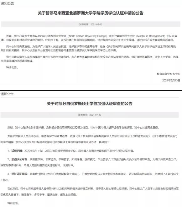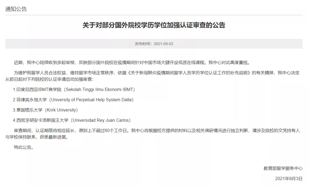 但是近日中國教育部卻接連發(fā)布了多條公告,直指那些在國內(nèi)上低質(zhì)量網(wǎng)課混學(xué)歷的“假留學(xué)生們”:針對部分高校以疫情為借口,在中國市場大肆開設(shè)低質(zhì)在線課程,教育部留學(xué)服務(wù)中心將對部分國外高校學(xué)歷學(xué)位加強(qiáng)認(rèn)證審核!