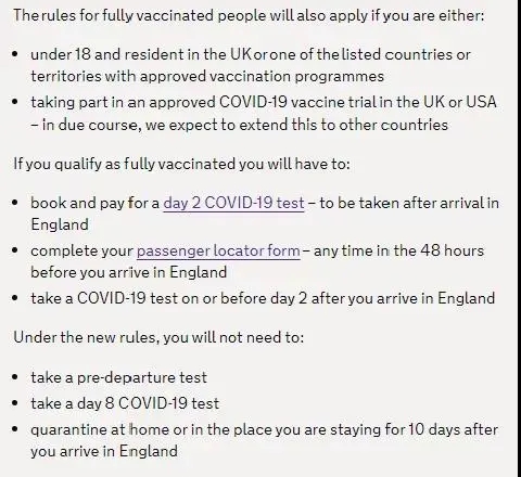 從紅色名單以外的國(guó)家入境英國(guó),若入境者已完成了兩劑疫苗的接種,則不需要進(jìn)行出發(fā)前的新冠檢測(cè)、到達(dá)英國(guó)后的第八天的檢測(cè)、以及到達(dá)英國(guó)后10天的隔離。