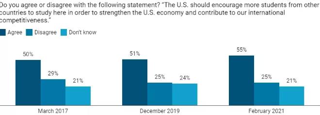 大多數(shù)受訪美國人認(rèn)為國際生對(duì)美國高技術(shù)勞動(dòng)力資源的貢獻(xiàn)至關(guān)重要:60%受訪者同意以下說法,“鑒于疫情帶來的挑戰(zhàn),引進(jìn)知識(shí)更淵博、技能更高超的勞動(dòng)力對(duì)當(dāng)今美國的重要性超過比以往任何時(shí)候,而國際學(xué)生有助于滿足這一需求。”