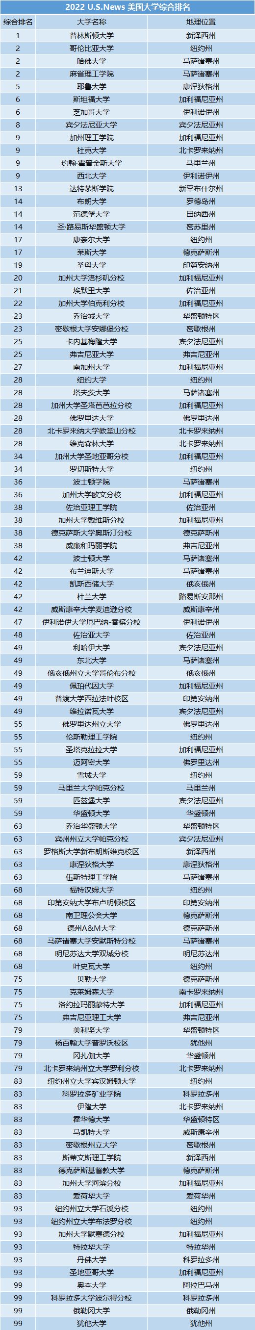 2022 U.S.News美國(guó)大學(xué)綜合排名榜單(TOP 100)