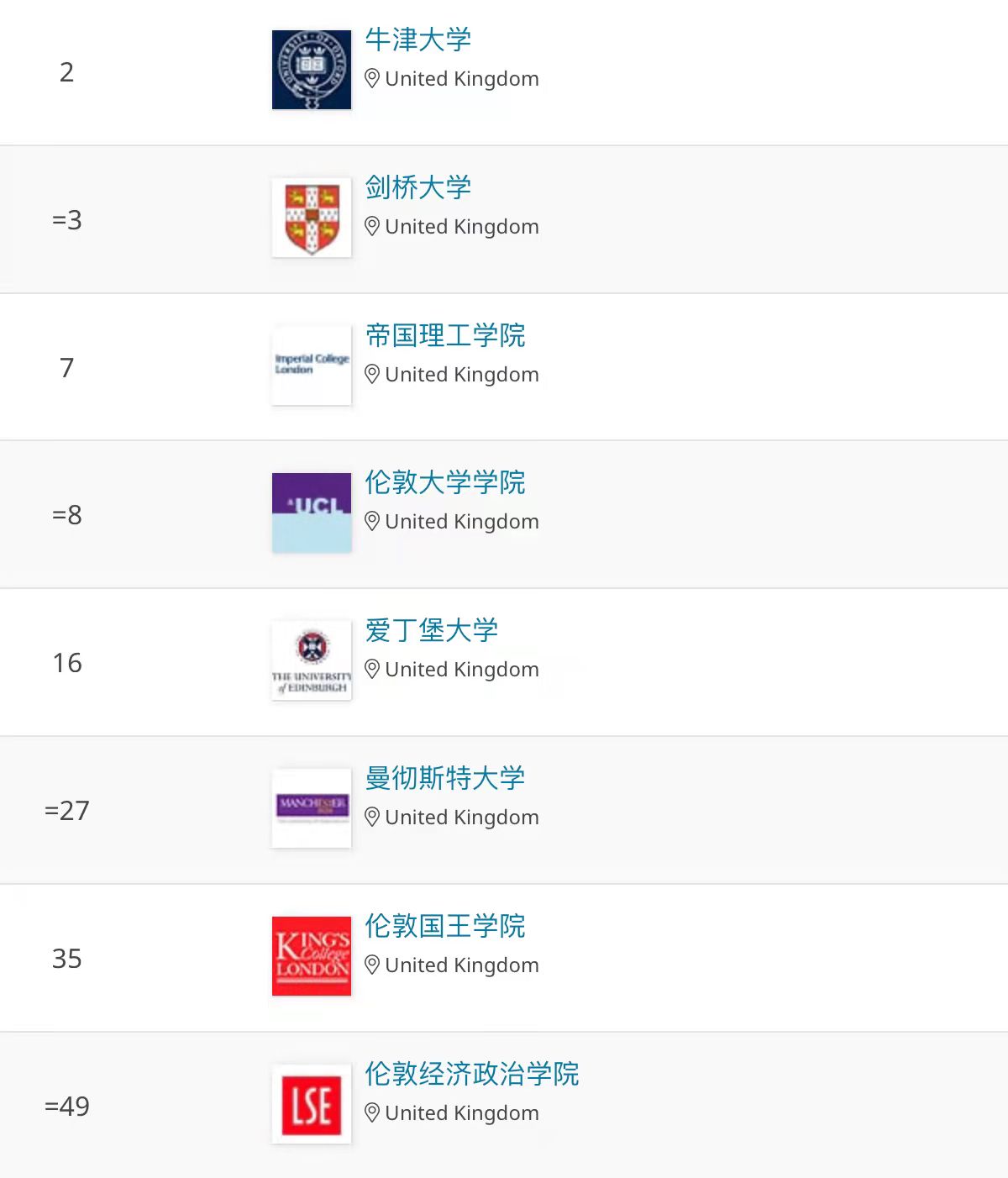 排名前100的英國大學(xué)整體呈現(xiàn)上升趨勢,牛津、劍橋、斯坦福、帝國理工學(xué)院、倫敦大學(xué)學(xué)院、愛丁堡大學(xué)等,排名均有提高;