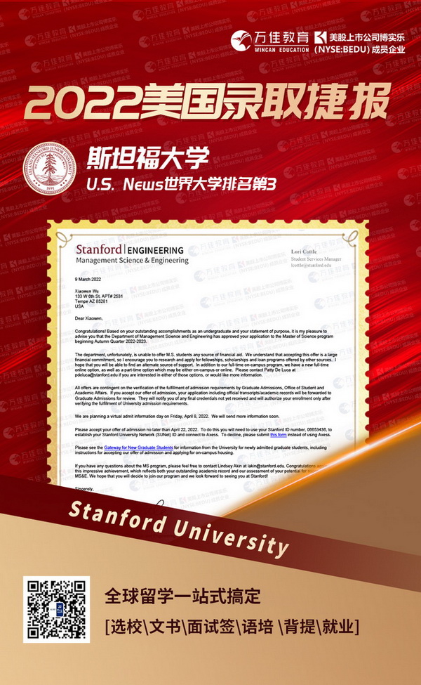 眾所周知斯坦福大學(xué)是全美頂尖的私立研究型大學(xué),全球大學(xué)高研院聯(lián)盟成員,斯坦福在多個(gè)國內(nèi)外大學(xué)排名中均在十強(qiáng)之列,申請難度可想而知。通過萬佳留學(xué)美國高端申請Grace老師團(tuán)隊(duì)針對學(xué)生的具體情況進(jìn)行了全面的規(guī)劃,針對學(xué)生的優(yōu)勢與弱勢,制定了具體的申請方案,再加上Ivy老師的專業(yè)指導(dǎo)及獨(dú)具特色的文書打磨,學(xué)生最終喜獲夢校斯坦福大學(xué)的錄取。