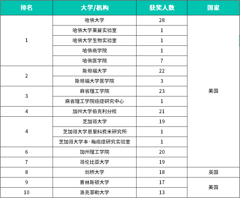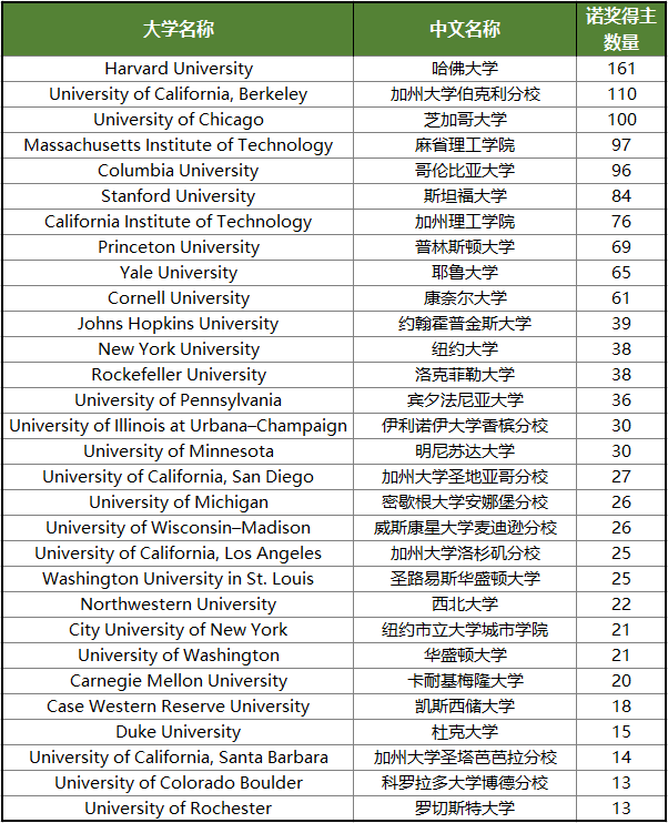 在世界范圍內(nèi),從數(shù)據(jù)統(tǒng)計上來看,獲獎?wù)咚厴I(yè)院校大部分都集中在美國。對大學(xué)而言,諾貝爾獎校友的數(shù)量不僅可以體現(xiàn)出學(xué)校的實力,更是其學(xué)術(shù)和科研能力的體現(xiàn)。